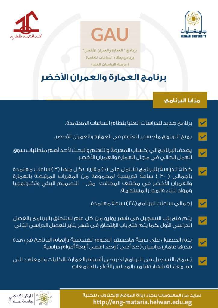 برنامج العمارة والعمران الأخضر هو برنامج خاص بمرحلة الدراسات العليا و يهدف البرنامج إلى تطوير قدرات الطالب على البحث العلمى، التفكير العلمى المنظم، دعم المهارات البحثية للمهندسين المعماريين، حيث يعمل البرنامج على تمكين المعماريين من العمل بكفاءة مهنية متطورة واكتساب خبرات علمية فى مجال العمارة والعمران الأخضر.